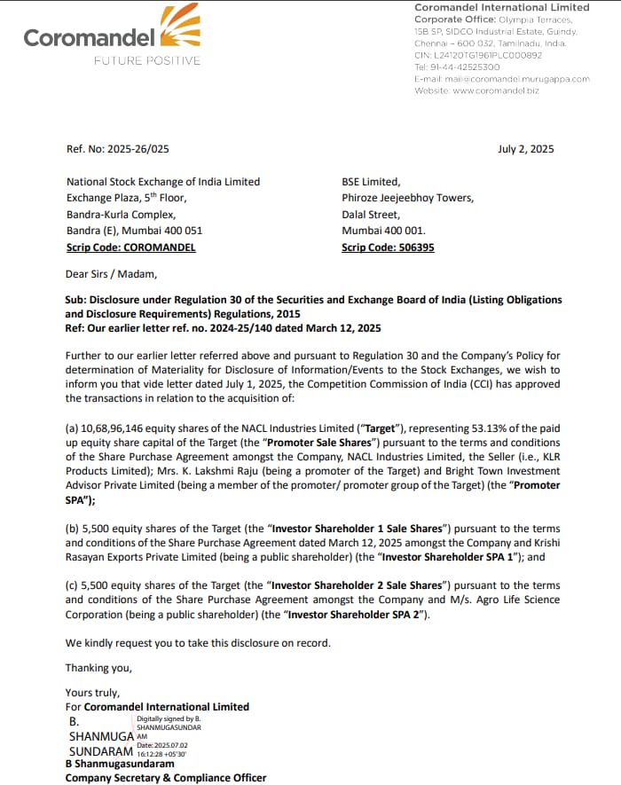कोरोमंडल इंटरनॅशनलला एनएसीएल इंडस्ट्रीजचे १०.६९ कोटी शेअर्स (५३.१३% हिस्सा) खरेदी करण्यासाठी सीसीआयची मान्यता मिळाली. 2 July 2025 by digitalspeednews.com