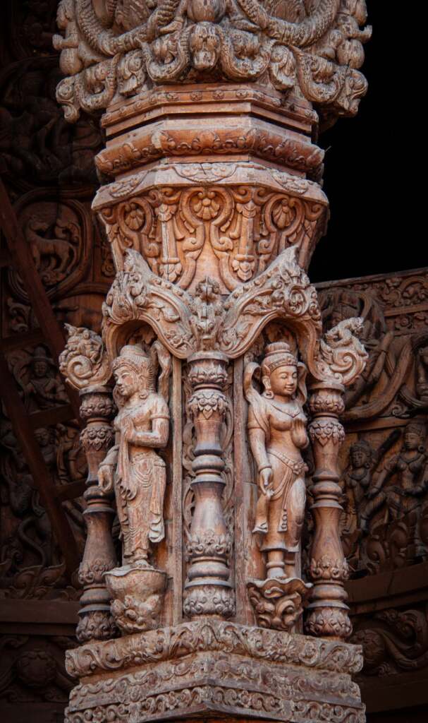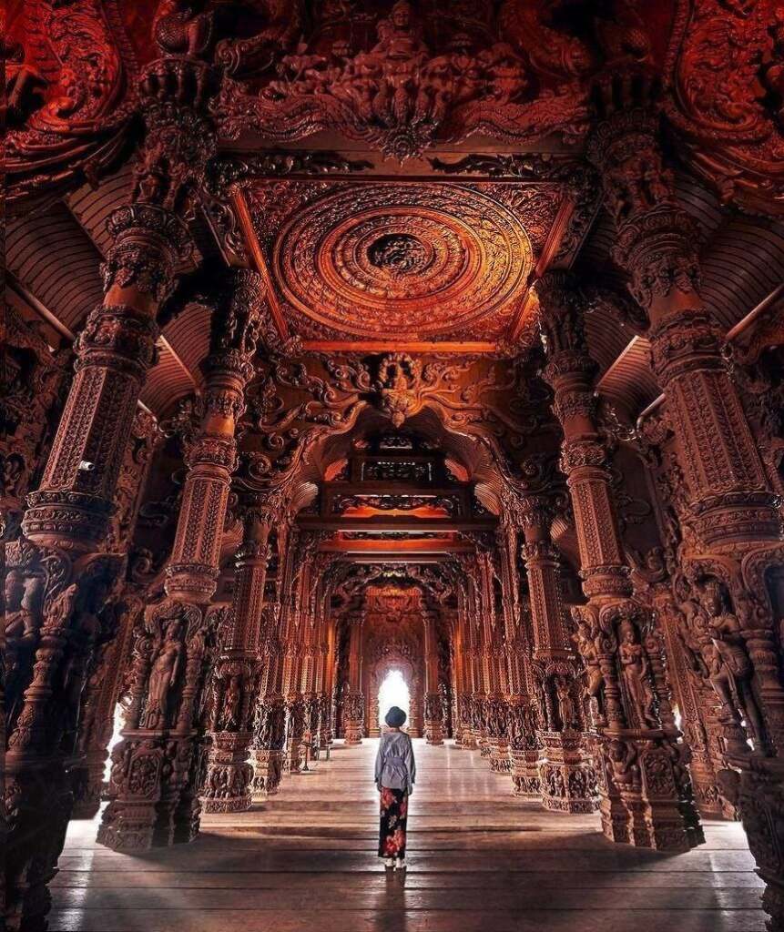 मंदिर पूर्णतः सागवान व इतर मजबूत लाकडांनी बांधलेलं आहे. प्रत्येक भिंत, दरवाजा, खांब आणि छप्पर यावर हिंदू, बौद्ध आणि प्राचीन आशियाई संस्कृतीतील शिल्पं कोरलेली आहेत. भगवान श्रीकृष्ण, विष्णू, शिव तसेच विविध देवतांच्या कथा येथे कोरीव कामातून जिवंत केल्या आहेत. या शिल्पकलेतून सत्य, धर्म, शांती आणि मानवतेचं महत्त्व अधोरेखित केलं आहे.