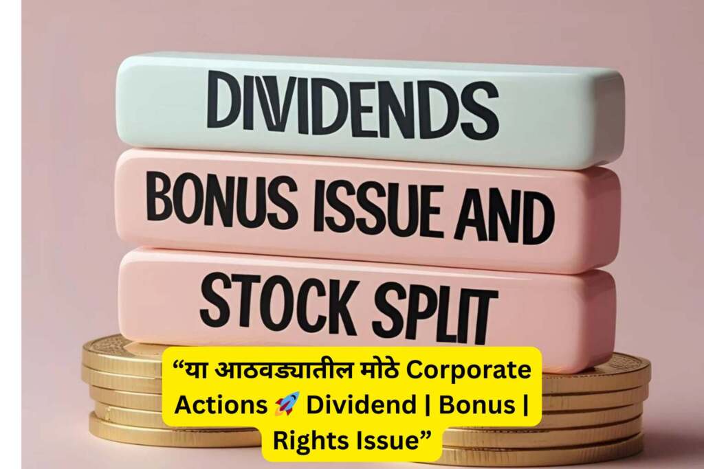 рднрд╛рд░рддреАрдп рд╢реЗрдЕрд░ рдмрд╛рдЬрд╛рд░рд╛рдд 8 рддреЗ 14 рд╕рдкреНрдЯреЗрдВрдмрд░ 2025 рдпрд╛ рдЖрдард╡рдбреНрдпрд╛рдд рдЕрдиреЗрдХ рдореЛрдареЗ рдХреЙрд░реНрдкреЛрд░реЗрдЯ рдЕреЕрдХреНрд╢рди (Corporate Actions) рд╣реЛрдгрд╛рд░ рдЖрд╣реЗрдд. рдпрд╛рдд рдбрд┐рд╡реНрд╣рд┐рдбрдВрдб (Dividend), рдмреЛрдирд╕ рдЗрд╢реНрдпреВ (Bonus Issue), рд░рд╛рдИрдЯреНрд╕ рдЗрд╢реНрдпреВ (Rights Issue) рдЖрдгрд┐ рд╕реНрдЯреЙрдХ рд╕реНрдкреНрд▓рд┐рдЯ (Stock Split) рдпрд╛рдВрдЪрд╛ рд╕рдорд╛рд╡реЗрд╢ рдЖрд╣реЗ. рдЧреБрдВрддрд╡рдгреВрдХрджрд╛рд░рд╛рдВрд╕рд╛рдареА рд╣рд╛ рдЖрдард╡рдбрд╛ рдЦреВрдк рдорд╣рддреНрддреНрд╡рд╛рдЪрд╛ рдард░рдгрд╛рд░ рдЖрд╣реЗ.