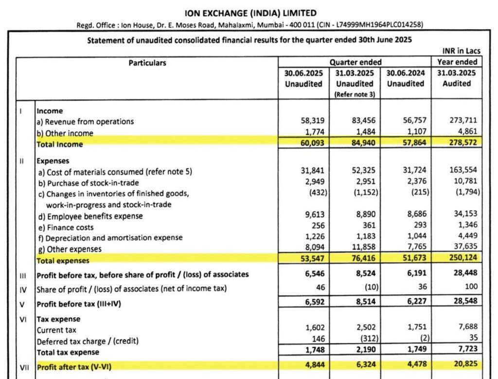 ION Exchange (India) Limited ने आकस्मिकत्व आणि स्थिरतेचा संगम असणाऱ्या Q1 FY26 (1 एप्रिल ते 30 जून 2025) तिमाहीचा निकाल जाहीर केला आहे. यामध्ये standalone ₹46.88 कोटी आणि consolidated ₹48.44 कोटी निव्वळ नफा नोंदवण्यात आला असून, अनेक आर्थिक बाबी आणि भविष्यातील दिशा दर्शवणारे घटक स्पष्ट झाले आहेत .